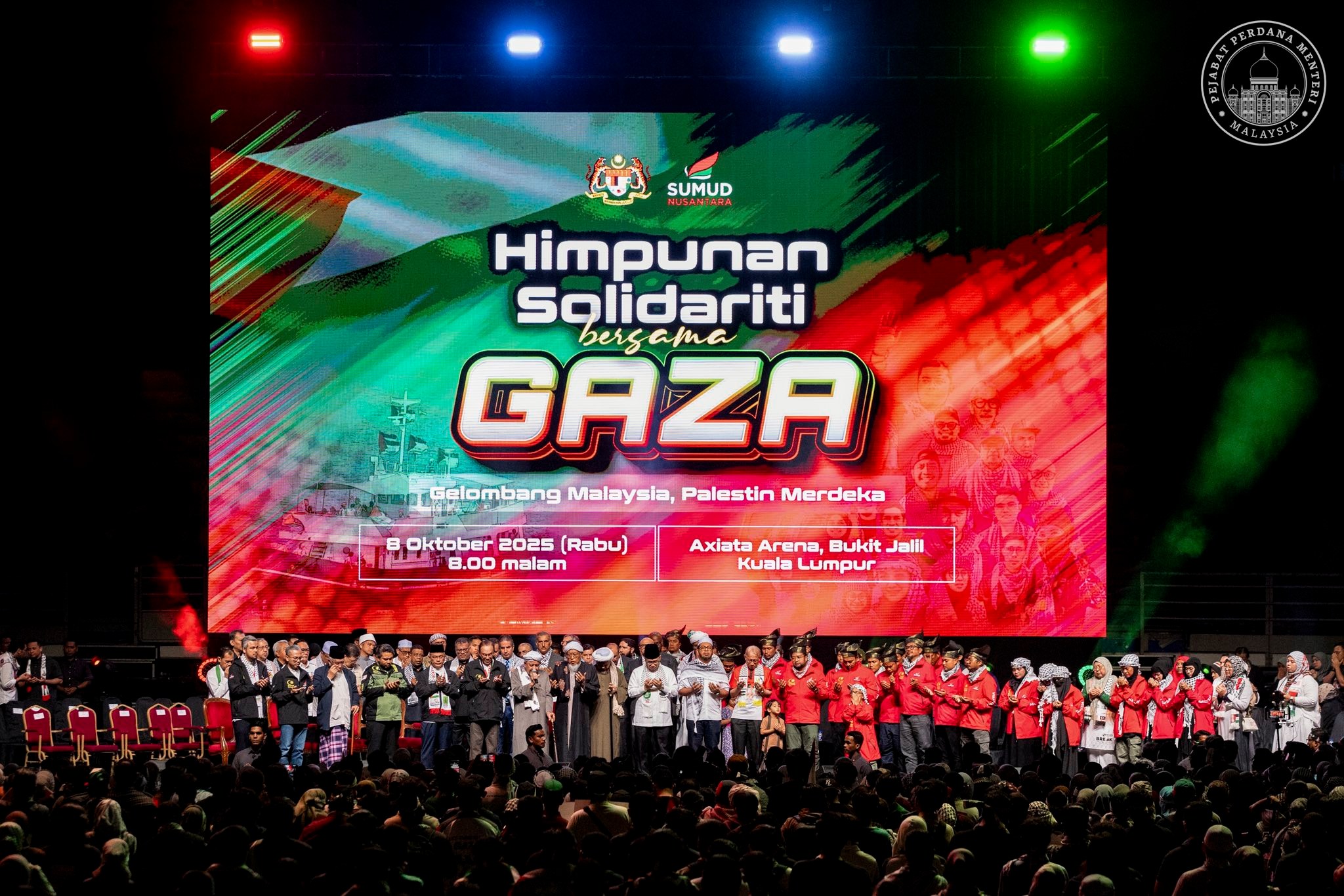 Perkara itu disuarakan Perdana Menteri ketika menghadiri Himpunan Solidariti bersama Gaza di di Axiata Arena, Bukit Jali yang dihadiri lebih 20,000 termasuk 23 sukarelawan Global Sumud Flotilla (GSF) yang baru tiba di tanah air semalam, selain jemaah menteri dan pegawai tertinggi kerajaan.