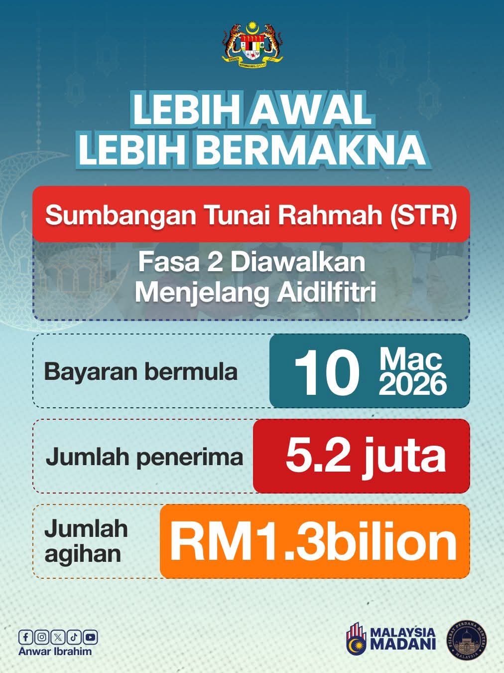 “Semoga ikhtiar ini sedikit sebanyak membantu rakyat dalam membuat persiapan Aidilfitri dengan lebih tenang dan gembira bersama keluarga serta insan tercinta, Insya-Allah,” ujar beliau. -MalaysiaMADANI